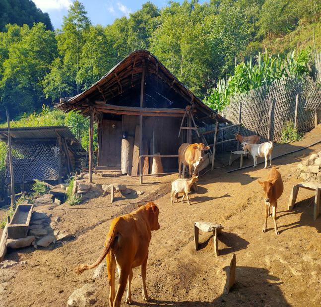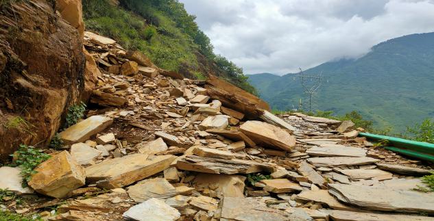 向驻地进发:我们乘车继续出发,在驱车约2千米后遇到山体塌方,路断了,我们只好停放好车辆,背上东西继续出发。我们顺着上山的小路往上走,山比较陡,走了约半个小时,大家已经是大汗淋漓,虽然已是下午五点多,但感觉依然是那么炽热。大家步伐沉重,三步一停,五步一歇,经过多次休息后,终于看到了今晚住宿的地方,傈僳火塘。