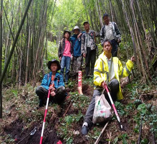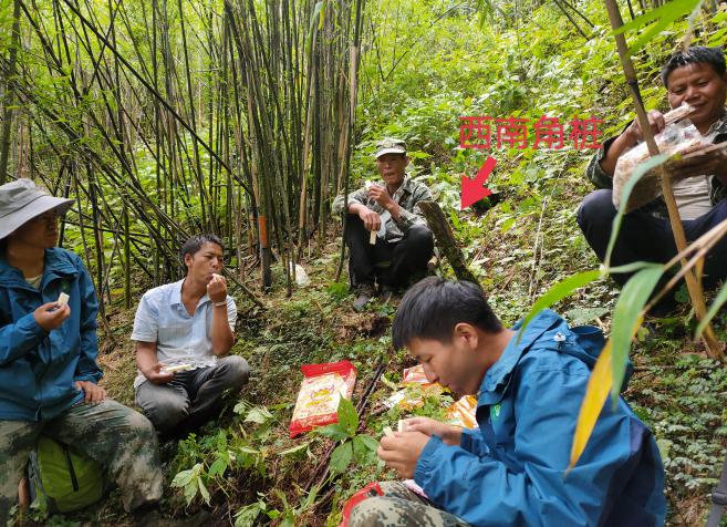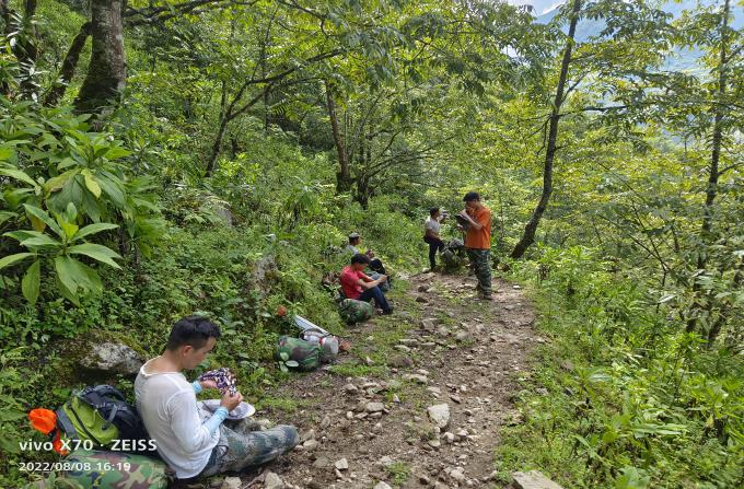开展调查及返程:找到西南角桩已是中午一点整,我们走了约五个半小时,已经很累了,趁着休息的时间大家赶紧吃了些干粮,补充体力,然后按照之前的分工展开调查。尽管大家都很努力,但还是花费了3个多小时的时间才完成了样地调查。大家吃了点东西,在样地合影留念,然后开启返程之旅。因为返程是下坡路,而且负重减轻了许多,我们仅用了三个多小时的时间,但返回驻地已经七点多了。我们向单位领导报告已经安全下山,回到火塘,大家都已经非常疲惫,在简单吃过晚饭后,我们都躺下休息了。8月10日早晨起来,大家小腿和大腿都有些酸疼,和火塘塘主告别后,我们便向下一个样地点出发了。