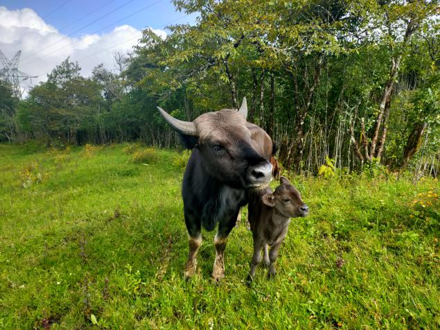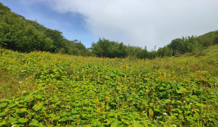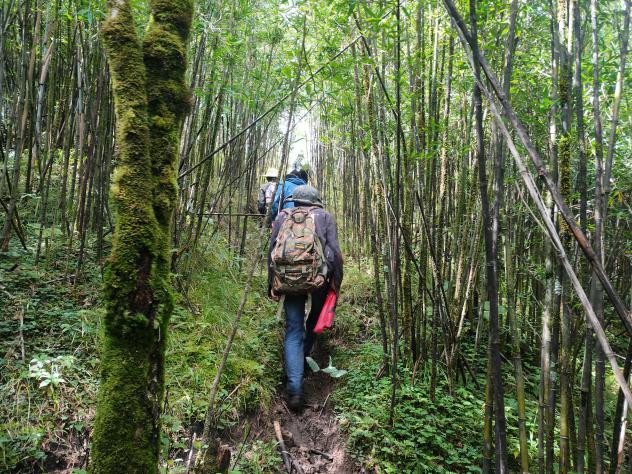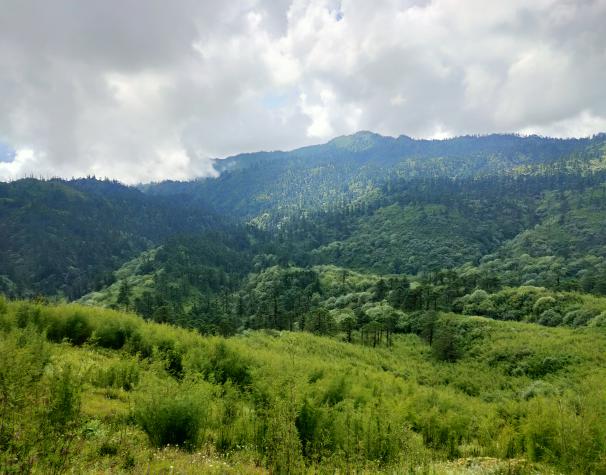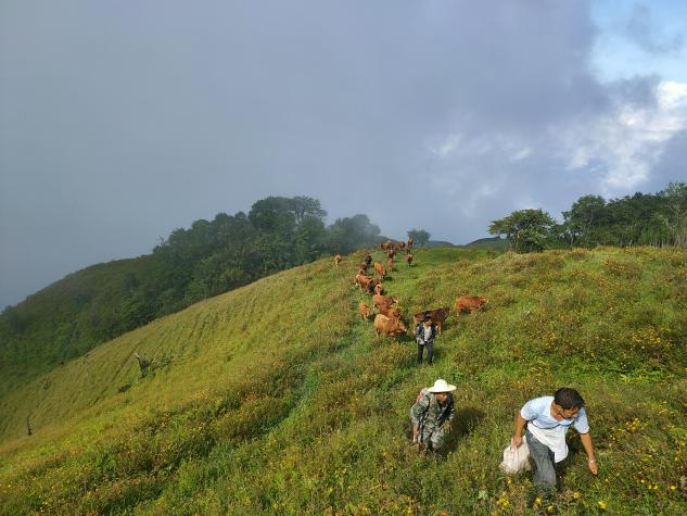 向样地进发:凌晨五点半起床准备早餐,七点一刻向样地进军。我们从常绿阔叶林走到冷杉林,从冷杉林走到高山杜鹃和箭竹林,跨越了几个植被类型。还有错把我们当成主人的黄牛追着我们走了一路,我们还看到了我国仅分布于独龙江流域和怒江流域的独龙牛。虽然一路风景美不胜收,但来不及细细欣赏,我们只顾一路攀爬。历经5个多小时的攀爬,终于到达山顶,竹林茂密、岔口较多,如果没有去过、或有熟悉环境的向导是很容易迷路的,在接近样地时向导也记不起具体位置了,通过定位我们很快就找到了样地西南角桩,那一刻,心里真的是说不出的开心。