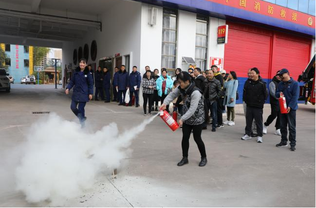 在消防宣传员的带领下,大家参观了内务设置、车辆器材、战斗装备等,了解了车辆器材装备的性能和功能,学习了灭火器使用方法以及基本灭火知识和自救常识,并参与了现场灭火演练。