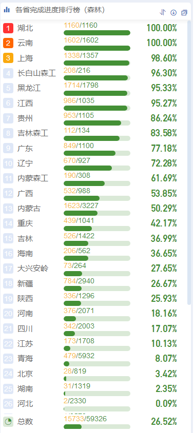 截至2024年6月3日,云南省森林样地外业调查工作在国家林草生态综合监测评价管理系统中完成率已达到100%,完成率全国排名第二名。