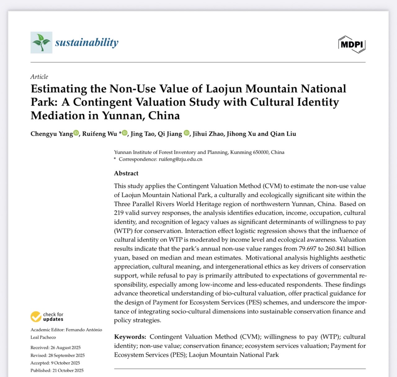 近期,院保护地中心在工商管理与生态经济交叉学科领域取得重要突破,研究成果《Estimating the Non-Use Value of Laojun Mountain National Park: A Contingent Valuation Study with Cultural Identity Mediation in Yunnan, China》被SCI(科学引文索引)和SSCI(社会科学引文索引)双检索期刊Sustainability收录,并在线发表。