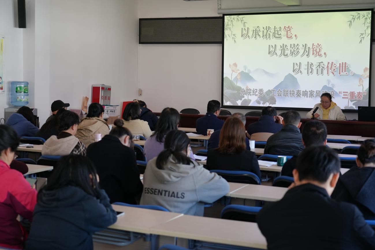 值得一提的是,本次活动前期,干部家属承诺书已发放至各党支部,邀请每个家庭共同书写廉洁约定。此次分院纪委与工会的联动,既体现了组织的严管厚爱,也彰显了深切的人文关怀,为分院健康发展注入了浓厚的家风正能量。